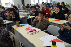 第1回のフォローアップ研修会は、令和8年2月5日に飯塚市の立岩交流センターにて開催しました。日本折紙協会認定講師でおりがみアーティストの宮本眞理子先生をお迎えし、子どもの成長に合わせたおりがみ遊びについて、実演を交えながら楽しく学ぶ時間となりました。