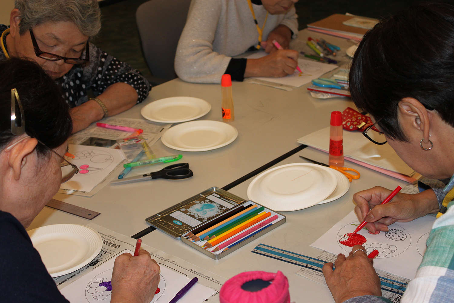 「紙皿を使ったおもちゃ作りの様子。真剣です。」